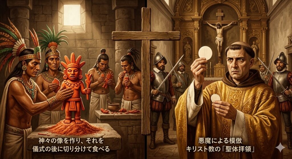 スペイン人たちは、アステカの儀式に強い衝撃を受けました。当時の人々はアマランサスの粉と蜂蜜を混ぜて神々の像を作り、それを儀式の後に切り分けて食べるという習慣を持っていました。これがキリスト教の「聖体拝領(パンをキリストの体として食べる儀式)」と酷似していたため、カトリック教会はこれを「悪魔による模倣」と断じ、異教の象徴として厳しく禁じたのです。