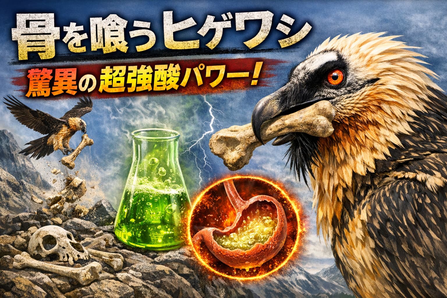 ヒゲワシが骨を消化できる最大の理由は、その驚異的な胃酸にあります。彼らの胃酸のpH値は1前後、あるいはそれ以下という測定結果もあり、これは車のバッテリー液(硫酸)に匹敵する強さです 。