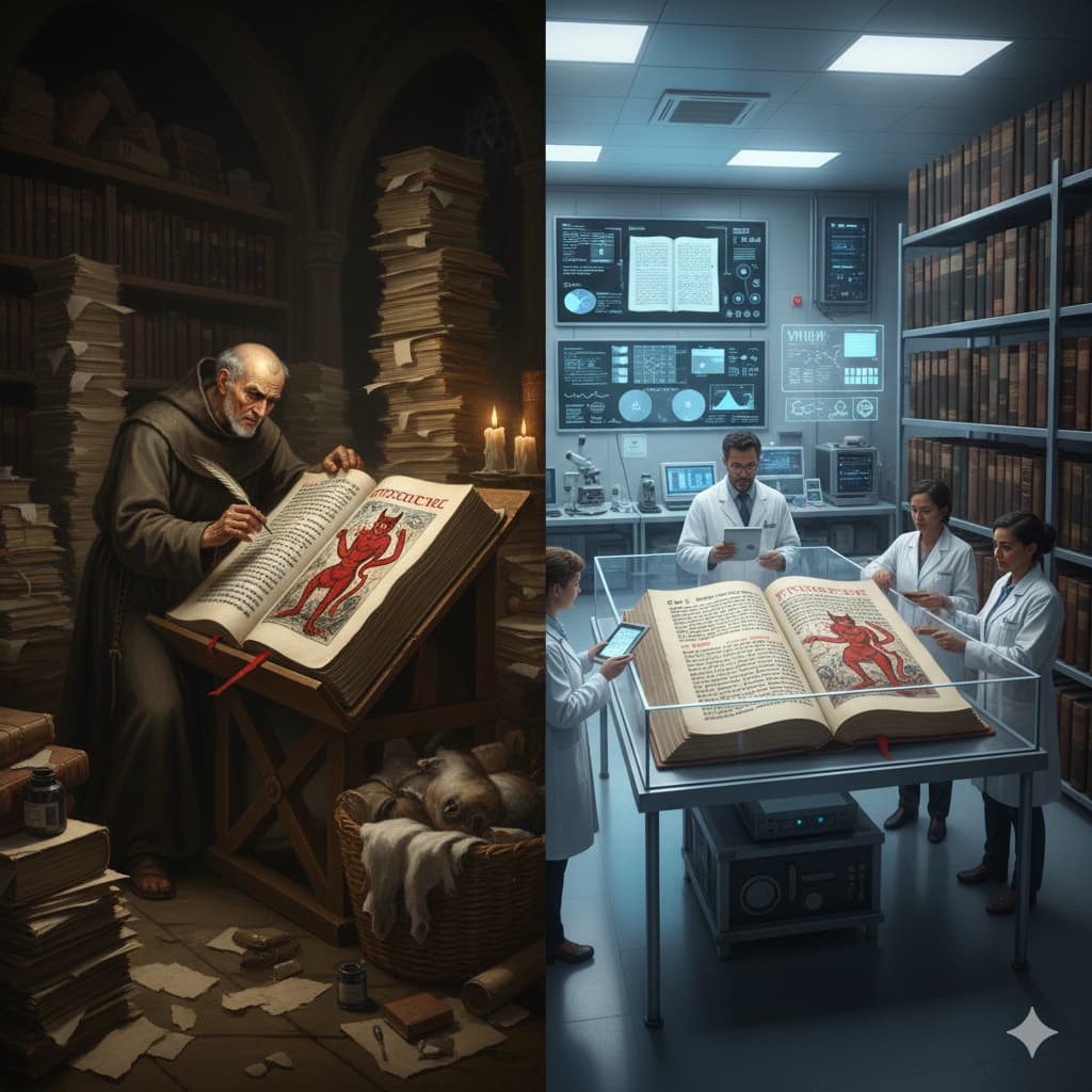 2. インクの組成の均一性: 使用されているインクの組成(化学的成分)も、写本の始めから終わりまで均一な特性を持っていることが判明しています。中世においてインクの品質を長期間維持し、継続的に大量に調合し続けることは至難の業です。この均一性は、一人の人物が長期間にわたり、同じ方法と環境で作業を続けたという事実を裏付けています。