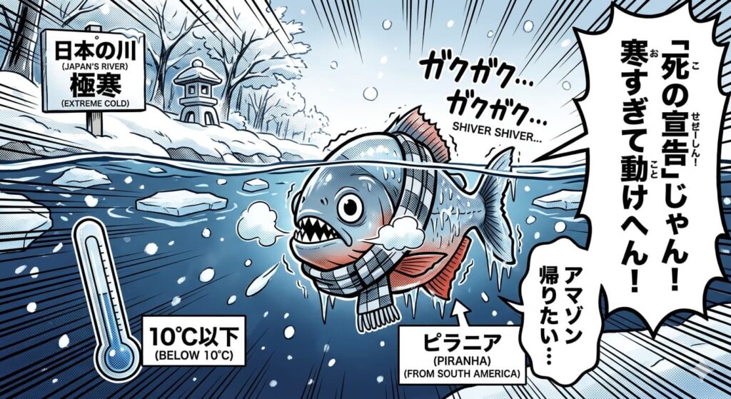 日本の淡水魚(コイ、フナ、ナマズなど)は、水温が下がると活動を停止して水底でじっと耐える「冬眠」に近い状態をとることができます。しかし、進化の過程で「冬」を経験してこなかったピラニアには、低温に耐えるメカニズムが備わっていません。
